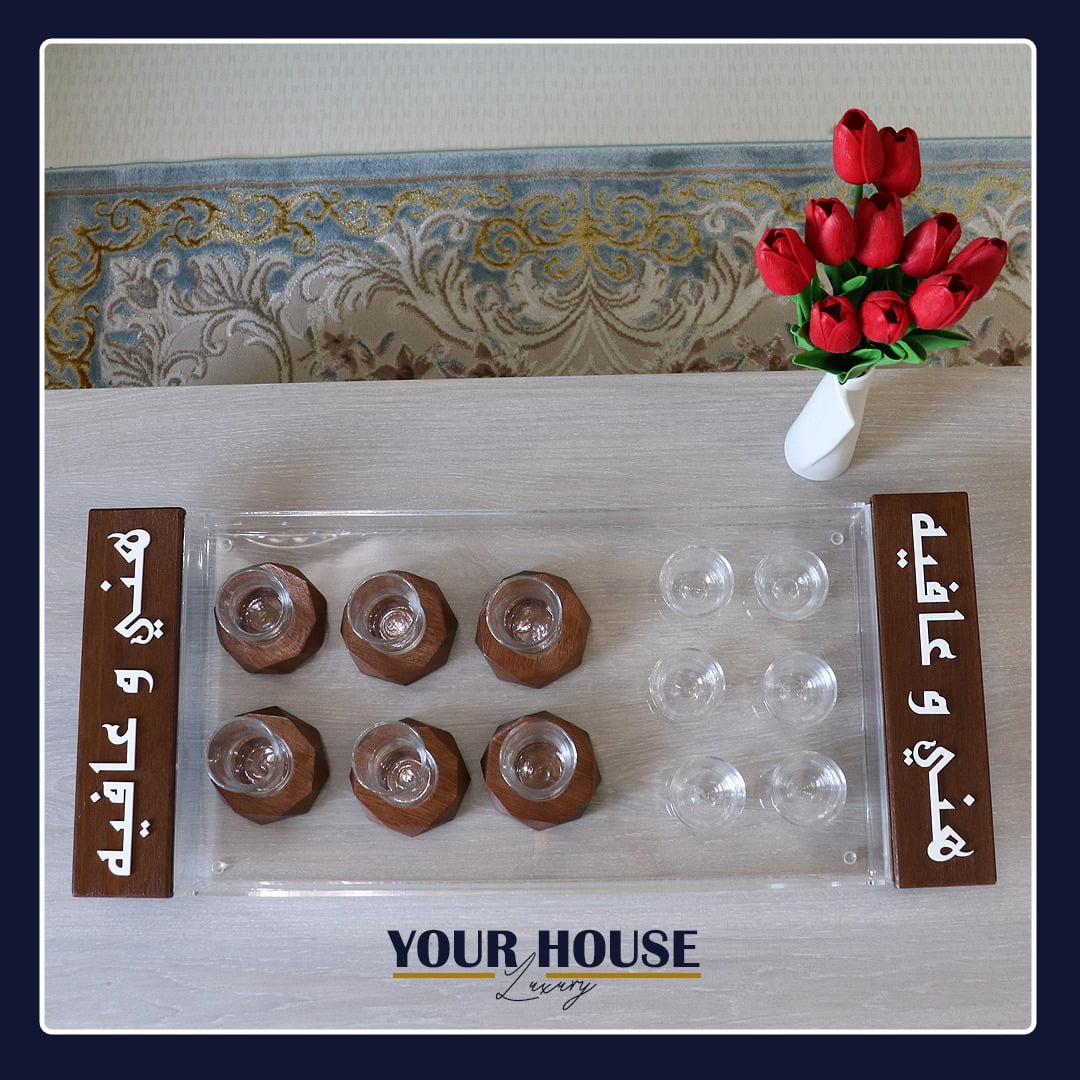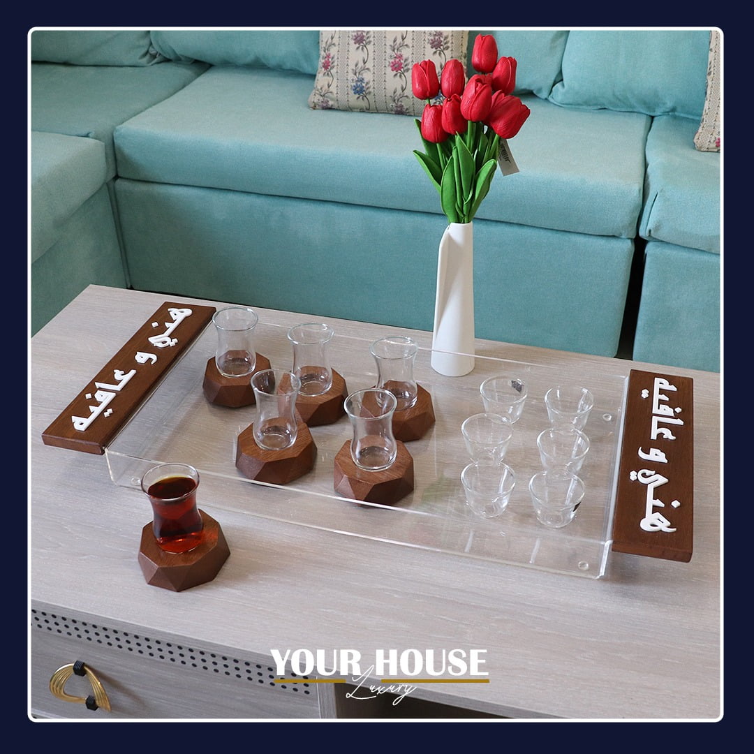 صينية أكريلك و خشب حجم كبير مع عبارة “هني و عافية” مع ٦ فناجين – ٦ استكانات ٦ قواعد لاستكانات الشاي